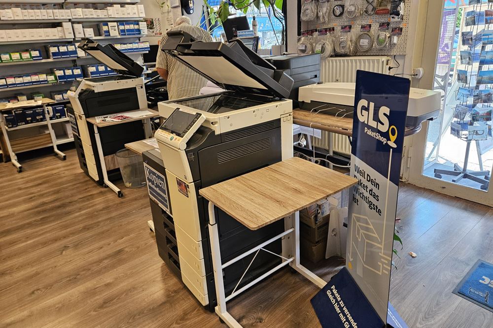 Wir haben zur Zeit acht verschiedene Kopierer, Drucker und Scanner, sowie Schneidebretter, Bindemaschinen, Laminiergeräte und Tische zum ordnen und sortieren.